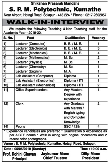 Spm Polytechnic College Lecturer Lab Assistant Jobs Walk In Interview Recruitment 2019 Solapur Govtjobonline In Govt Jobs Online Latest Recruitment Notifications 2020 2021