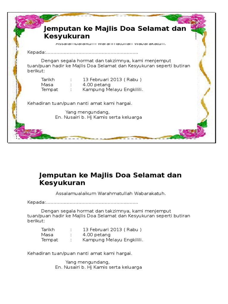 Jemputan Majlis Kesyukuran Dan Doa Selamat Doc