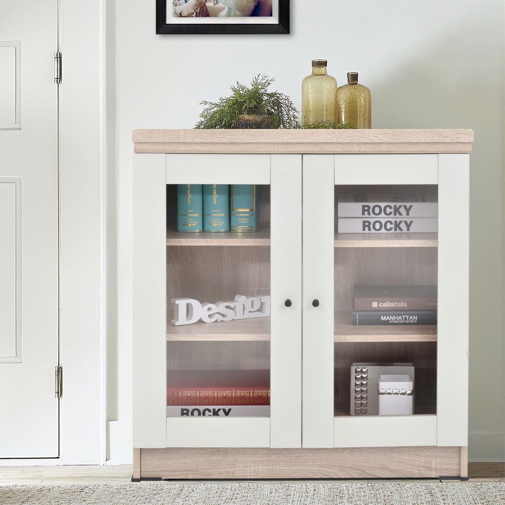 Umpamanya suatu aksesorir guci kecil asesoris bentuk makhluk hidup majalah serta sejenisnya. Cocok dipadukan dengan ruang tamu cat warna putih dan hitam. Lemari hias minimalis satu ini memiliki bentuk melebar dan tidak terlalu tinggi.