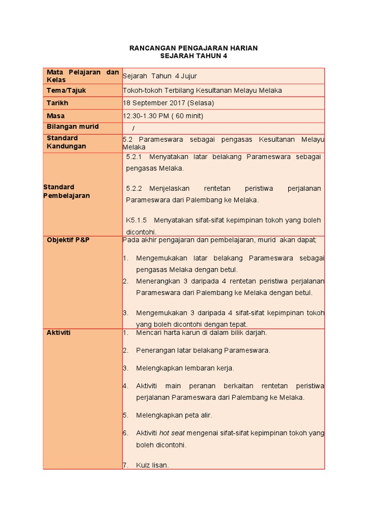Rancangan Pengajaran Harian Sejarah Tahun 4 Mata Pelajaran Dan Kelas Tema Tajuk Tarikh Masa Bilangan Murid Standard Kandungan